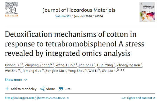 近日,我校斗鱼直播 刘伟团队在期刊 Journal of Hazardous Materials (中科院一区top期刊,IF=11.3)上发表了题为Detoxification mechanisms of cotton in response to tetrabromobisphenol A stress revealed by integrated omics analysis的研究论文。该研究