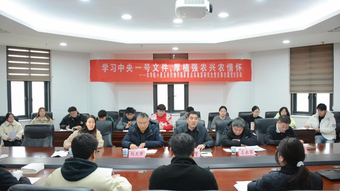 小麦玉米作物学国家重点实验室研究生党支部在龙子湖校区第一实验楼开展"学习中央一号文件 厚植强农兴农情怀"主题党日活动。院党委委员、副院长李浩贤,教育部作物生长发育调控重点实验室主任刘天学教授,国家小麦工程技术研究中心副主任王永华研究员,正科级组织员李盼,研究生辅导员赵倩男以及小麦玉米作物学国家重点实验室研究生党支部成员、农学专业学生第一党支部学生代表参加了本次活动。活动由李浩贤主持。