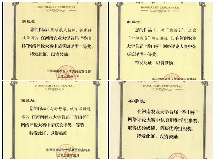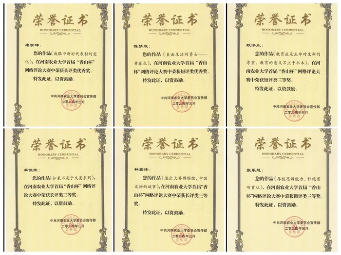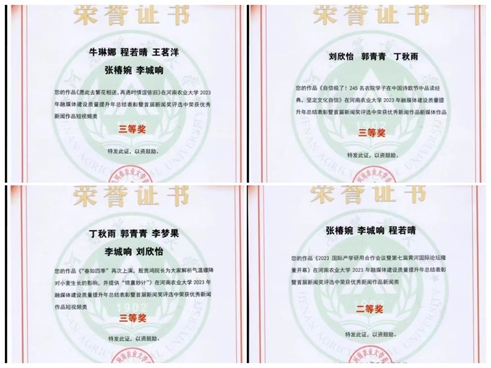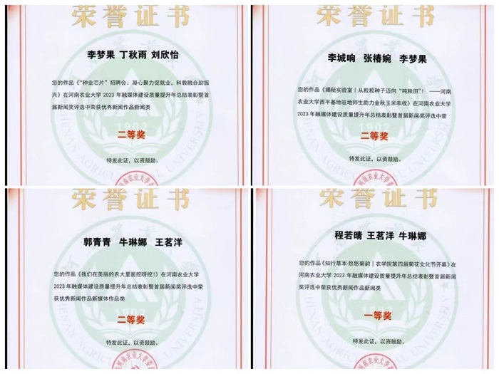 西平基地驻地师生助力金秋玉米丰收》、《“种业芯片”招聘会:凝心聚力促就业,科教融合助振兴》、《2023国际产学研用合作会议暨第七届黄河国际论坛隆重开幕》荣获优秀新闻类作品新闻类二等奖;《自信极了!245名农院学子在中国诗歌节中品读经典,坚定文化自信》荣获优秀新闻类作品优秀新媒体作品;《“春如四季”再次上演,殷贵鸿院长为大家解析气温骤降对小麦生长的影响,并提供“锦囊妙计”》、《愿此去繁花相送,再遇时情谊依旧》荣获优秀新闻类作品短视频类三等奖。