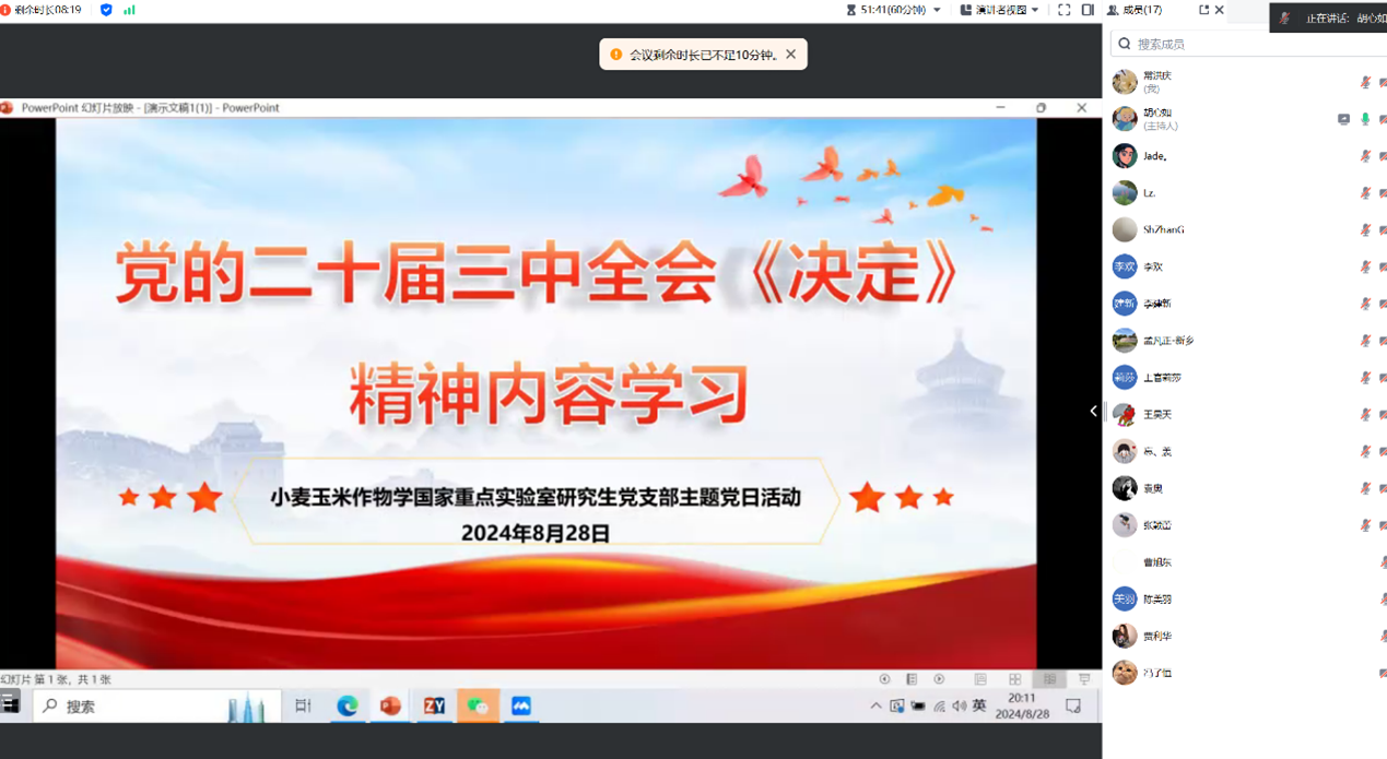 小麦玉米作物学国家重点实验室研究生党支部积极响应号召,开展学习贯彻党的二十届三中全会精神主题党日活动。此次活动旨在引导广大研究生党员深刻领会全会精神,将学习成果转化为推动农业科技创新、服务国家粮食安全的实际行动。