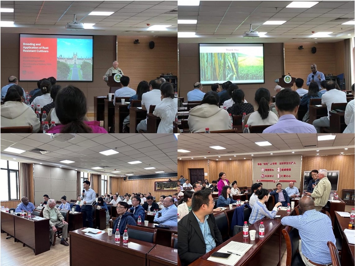 院长王道文研究员主持。陈锋教授、郑文明教授、刘文轩教授、丁顺利教授分别就各自课题组开展的作物生物与非生物胁迫研究方向相关课题进行了介绍,尤其是在小麦抗条锈病基因、抗茎基腐病基因克隆与功能研究、小麦叶锈菌基因组学、小麦抗白粉病基因克隆与功能研究以及真菌病原菌与寄主互作等多个研究课题的最新进展方面与McIntosh院士和Lagudah院士进行了多学科多角度的深入的交流与探讨。