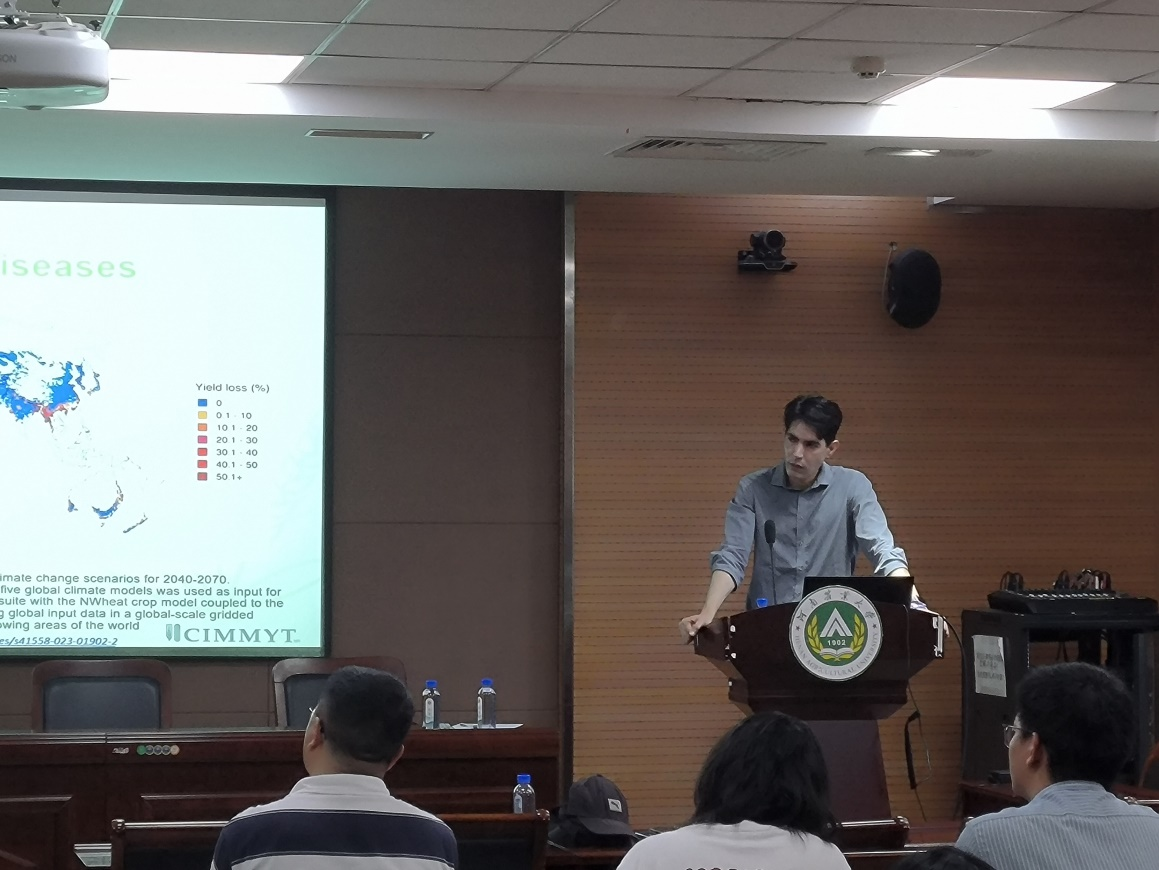 第七期CIMMYT-中国小麦玉米科学创新国际论坛在龙子湖第一实验楼南321报告厅开讲。墨西哥总部国际玉米小麦改良中心的Diego N. L. Pequeno教授以“Global wheat simulation modeling applications for climate change and disease damage assessment”为题,介绍了作物模型并详细介绍了DSSAT模型,强调了作物模型在未来气候变化情境下的作物适应性研究以及作物模型在小麦病虫害模拟和预测方面的应用。Diego N. L. Pequeno教授的工作主要集中在模拟作物性状影响情景,以指导小麦育种和农艺在区域和全球尺度下的生物和非生物胁迫条件下向最好性状组合发展。CIMMYT联合中心熊伟研究员和斗鱼直播