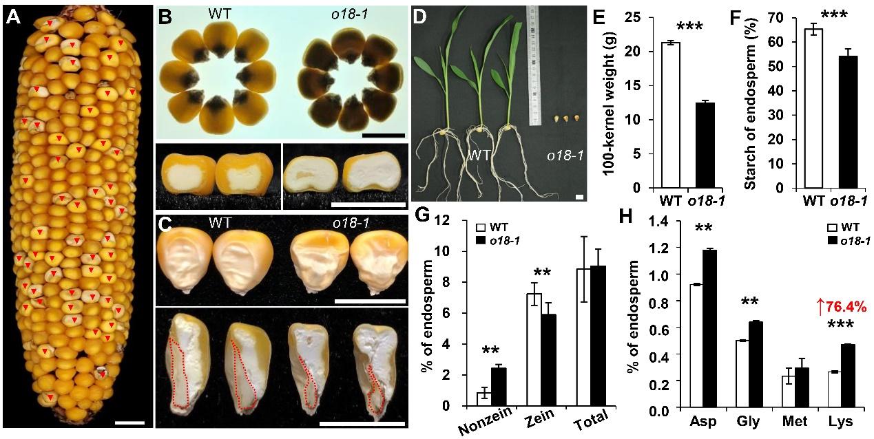 籽粒是光合产物积累的重要储存器官,直接决定了作物的产量和品质。籽粒灌浆是玉米等禾本科作物生产的重要限制因子,伴随着剧烈的细胞能量代谢过程。维生素B2,即核黄素,是诸多细胞代谢反应辅助因子(FMN和FAD)的合成前体,是人体和动物所必需的基础性营养物质。与动物不同,植物、细菌和真菌可以通过进化上保守的途径从头合成核黄素。然而,核黄素调控植物生长发育(特别是作物籽粒灌浆)的机制还不清楚。课题组鉴定了一个新的玉米粉质胚乳突变体,命名为opaque18;该突变体赖氨酸含量增加76.4%,但百粒重和淀粉含量降低且胚胎致死(图1)。通过图位克隆、等位突变测试和功能回补证明ZmRIBA1是导致o18突变表型的目的基因。O18基因编码具有DHBPS和GCHⅡ活性的双功能酶,起始核黄素生物合成途径。