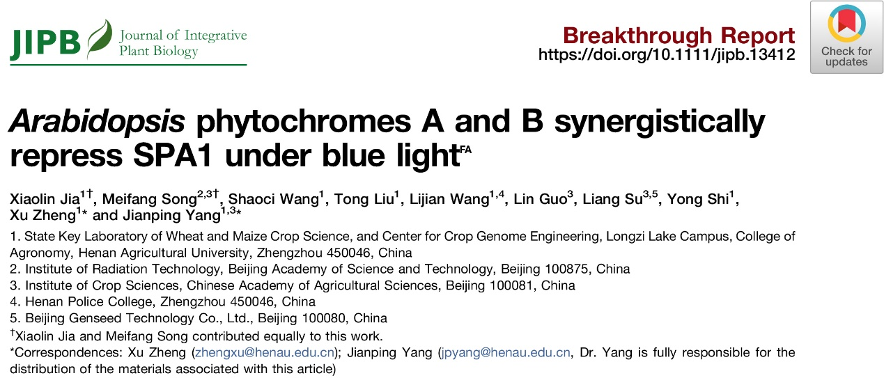 作物基因组与分子育种中心杨建平研究员团队和郑旭研究员团队联合解析了光敏色素介导蓝光信号转导的分子机制,研究成果以“Arabidopsis phytochromes A and B synergistically repress SPA1 under blue light”为题发表于国际Top期刊Journal of Integrative Plant Biology(2023, Doi:org/10.1111/jipb.13412, IF: 11.38)上。