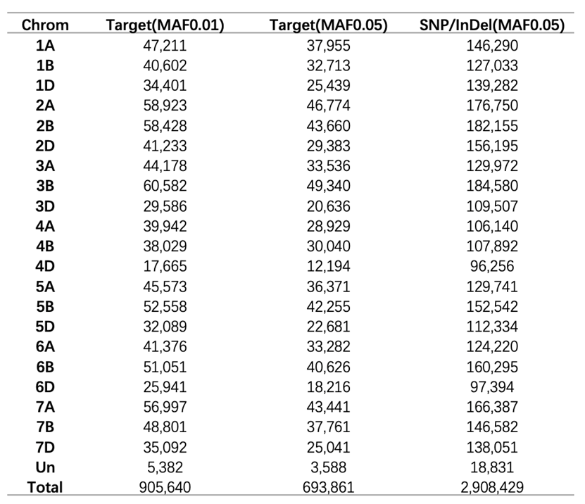 为更好的适用于国内现代品种的基因组学分析,在中国春参考基因组的基础上,使用多个现代品种基因组,如矮抗58、科农9204及Fielder进行比较基因组学及PAV分析,基于现代品种含有的易位系、渐渗系片段分析额外获得的100K SNP/InDel信息也整合入该芯片中。