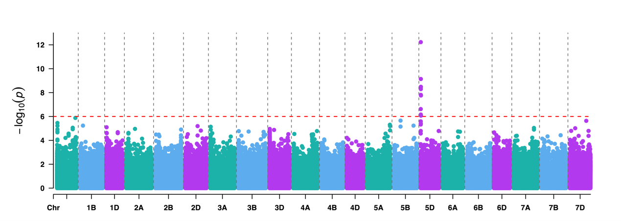 图 4 WheatPan800K 芯片应用于 GWAS 分析