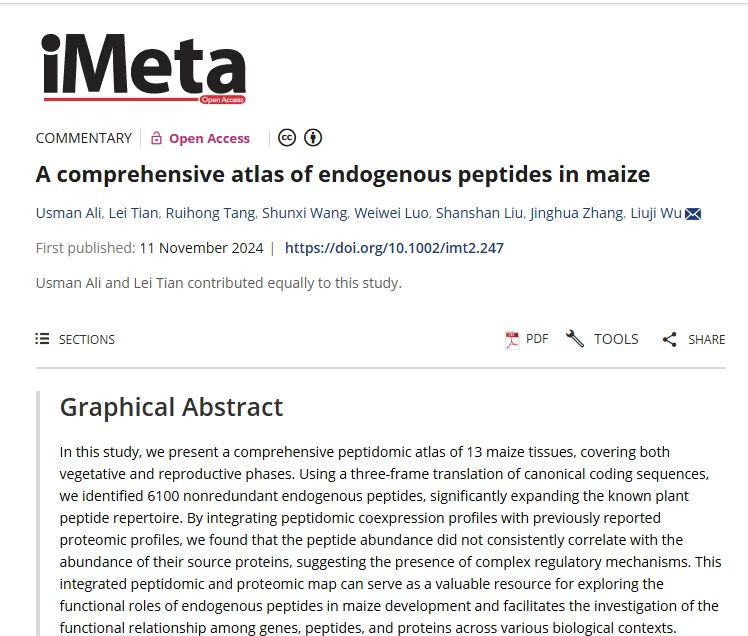 吴刘记课题组在植物(玉米)内源肽的研究方面取得突破性进展,于2024年11月11日在国际著名期刊《iMeta》(IF: 23.7)在线发表了题为“A comprehensive atlas of endogenous peptides in maize”的学术论文。该研究首次构建了植物(玉米)内源肽的全景图谱,解析了内源肽在不同发育阶段的动态表达模式和组织特异性分布,揭示了生物体内内源肽存在不同于源蛋白的表达调控机制。该研究将为理解植物内源肽的调控机制奠定重要基础,为植物生物学研究提供新的视角,同时,也为未来利用内源肽进行作物改良提供优异候选资源。