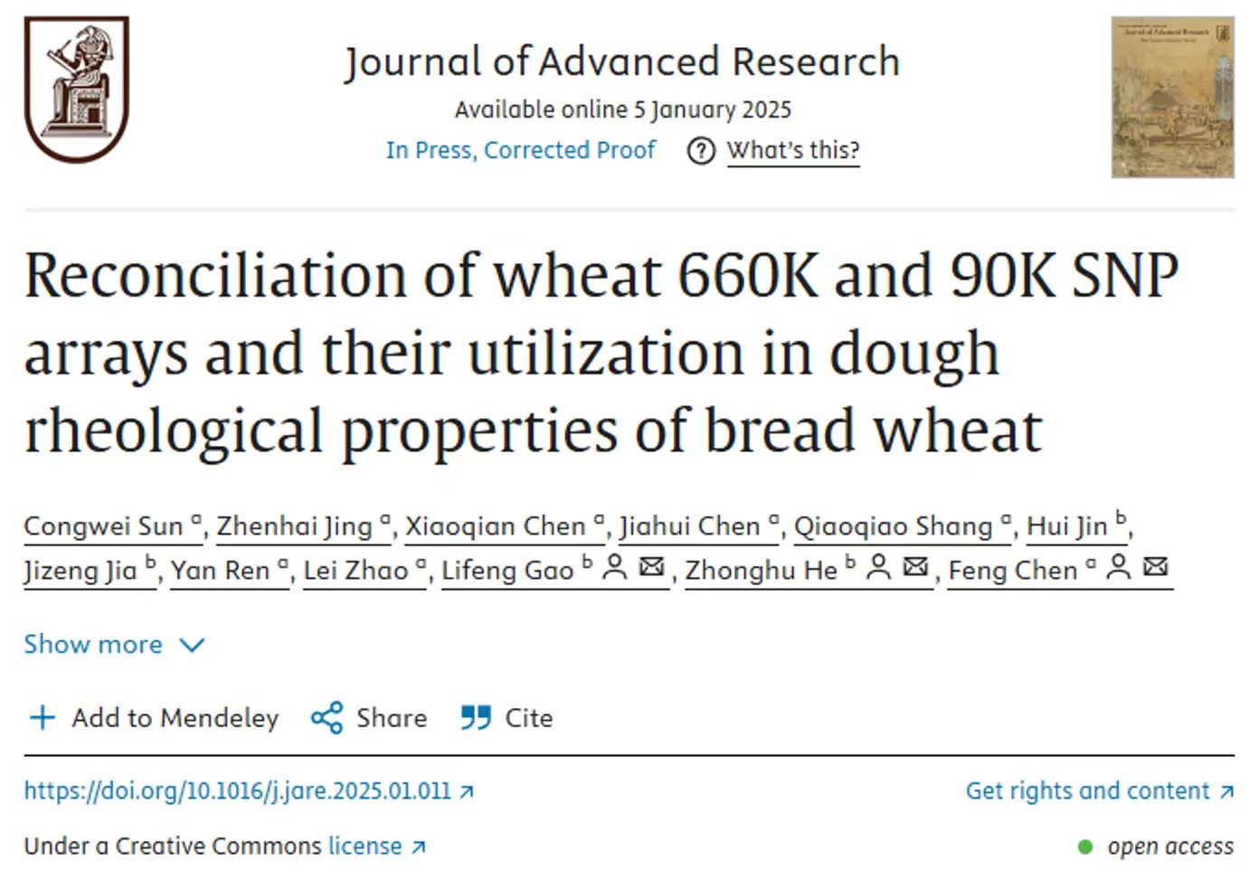 陈锋教授团队联合中国农科院作科所何中虎、高丽锋团队,在国际著名学术期刊Journal of Advanced Research(IF=11.4)在线发表了题为“Reconciliation of wheat 660K and 90K SNP arrays and their utilization in dough rheological properties of bread wheat”的研究论文。