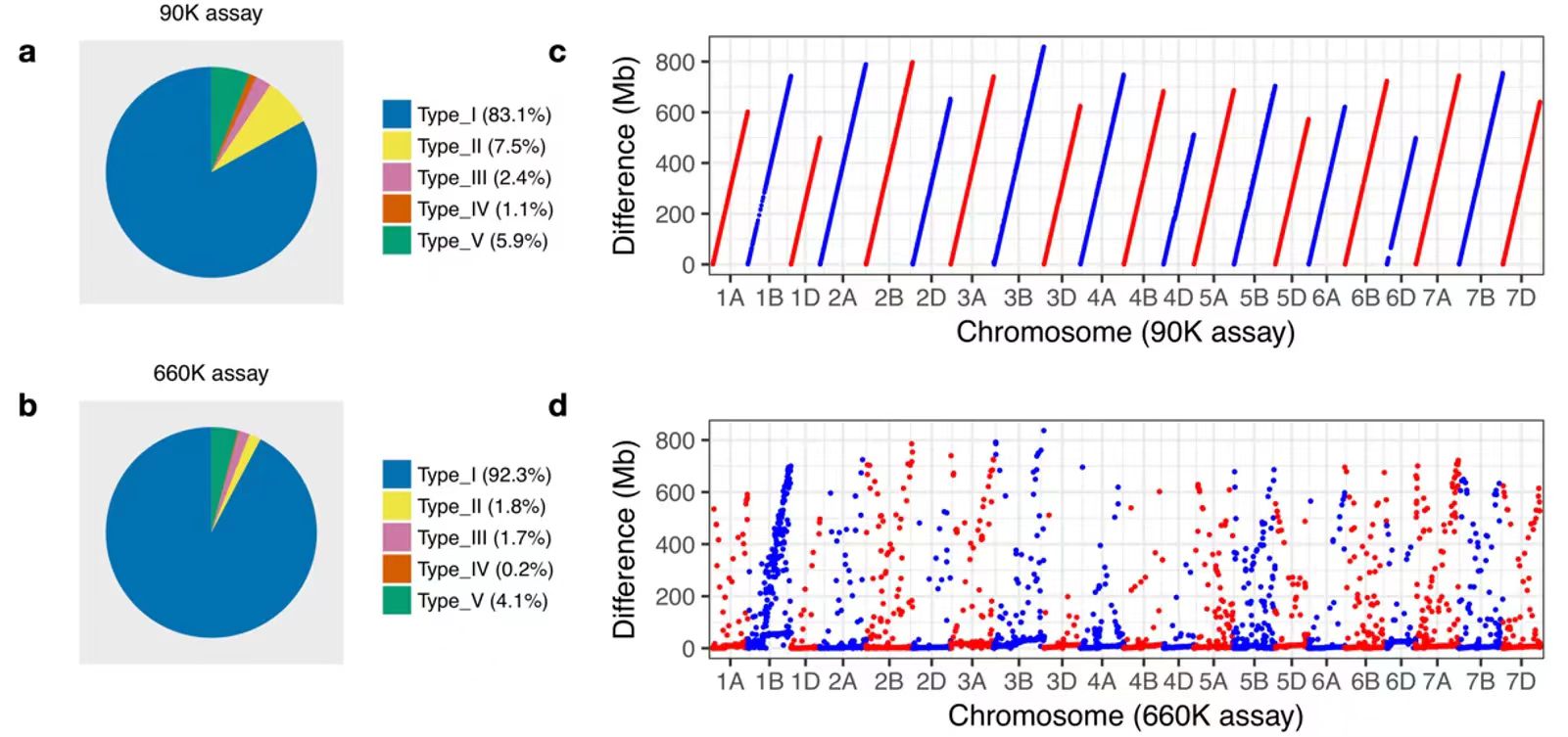 a-b:小麦90K和660K芯片中5种标记百分比;c-d:更新前后物理位置之间差异