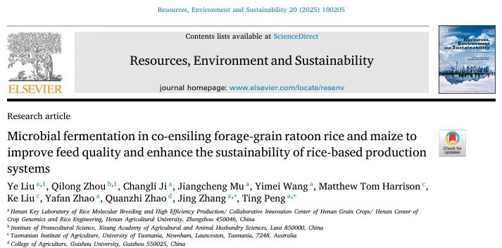 彭廷教授团队在环境科学与生态学1区Top期刊《Resources, Environment and Sustainability》发表题为“Microbial fermentation in co-ensiling forage-grain ratoon rice and maize to improve feed quality and enhance the sustainability of rice-based production systems”的研究论文,阐明通过共青贮饲料-谷物再生稻和玉米的微生物发酵提高饲料质量并增强基于水稻的生产系统的可持续性。