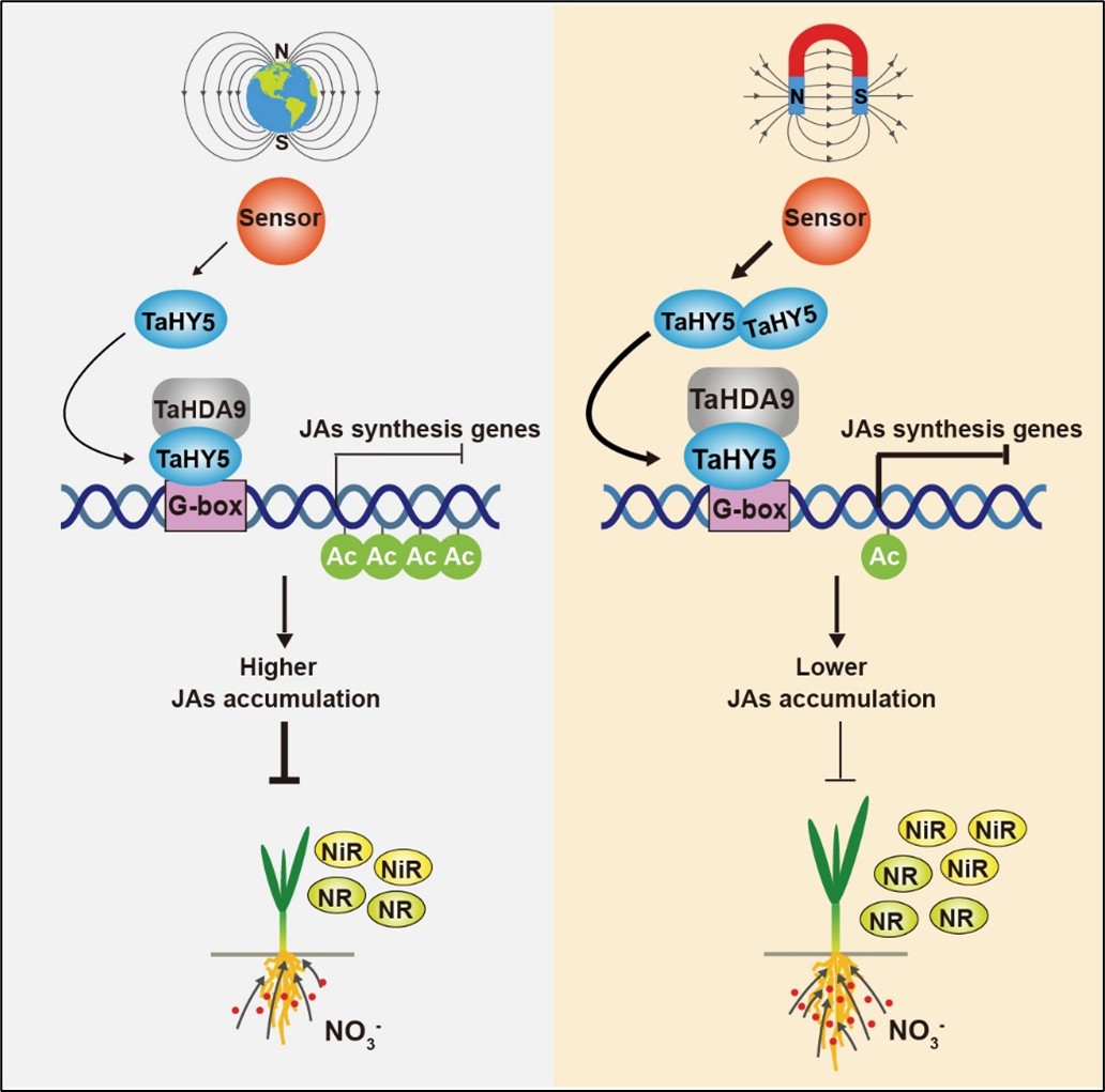 该研究以小麦为材料,发现静态磁场处理可显著促进小麦幼苗生长。转录组分析表明,磁场对基因表达的调控具有光依赖性,白天差异表达基因显著富集于氮代谢、茉莉酸合成及光信号通路。生理试验证实,磁场处理可增强小麦对硝态氮的吸收与同化,并抑制茉莉酸类物质积累。进一步研究显示,外源茉莉酸处理可消除磁场对氮素同化的促进作用,表明茉莉酸信号介导了磁场的调控效应。机制研究表明,光信号通路核心转录因子TaHY5是磁场响应的关键调控因子。通过CRISPR/Cas9技术获得TaHY5-A/B/D三突突变体后,植株对磁场的响应消失,且茉莉酸积累显著上升、氮同化能力下降。分子生物学试验进一步揭示,TaHY5与组蛋白去乙酰化酶TaHDA9形成转录抑制模块,直接结合茉莉酸合成基因启动子,降低H3K9ac修饰水平,从而抑制茉莉酸合成基因表达,最终促进氮素同化。该研究首次将环境物理因子(磁场)与作物养分利用(氮同化)通过光信号、激素信号串联形成完整调控网络,不仅深化了对植物磁响应机制的认知,更突破了传统“化学施肥增效”的思维局限,为开发绿色环保的物理农业增产技术提供重要理论依据。