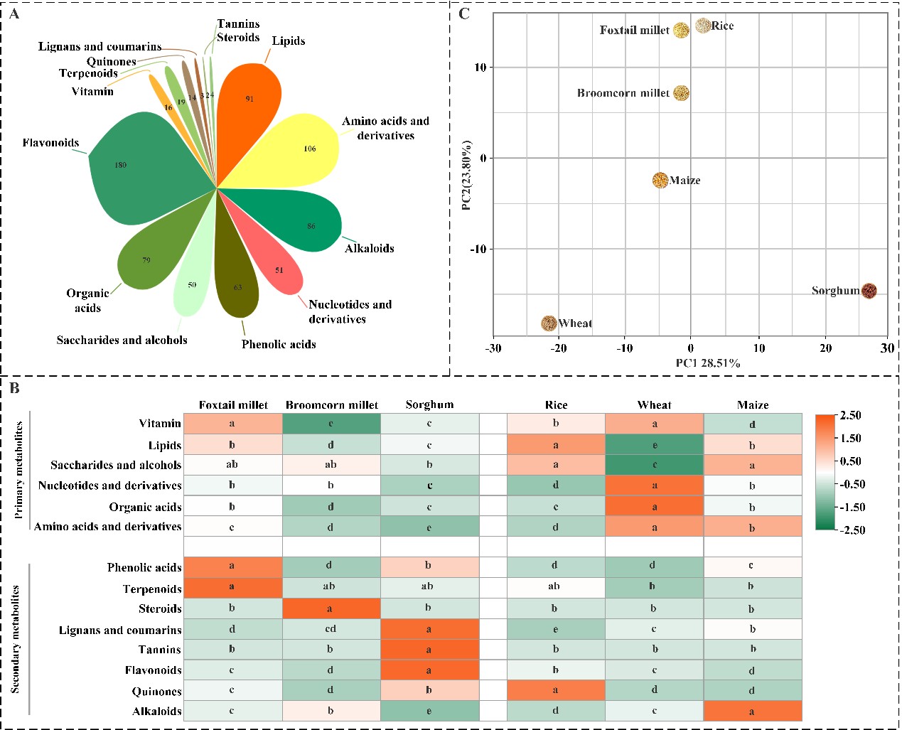 该研究使用UPLC-MS/MS检测平台杂粮和粗粮进行了代谢组学分析。共鉴定出783种代谢物,包括341种初生代谢产物、424种次生代谢产物和18种未分类化合物。主粮作物在初生代谢产物含量上表现出明显优势;而杂粮则展现出更强大的次生代谢产物多样性,谷子的酚酸类物质含量显著较高;糜子富含生物碱和独特的甾体化合物;高粱则拥有最全面的次生代谢产物谱系,尤其在单宁、香豆素和类黄酮的含量上优势突出。