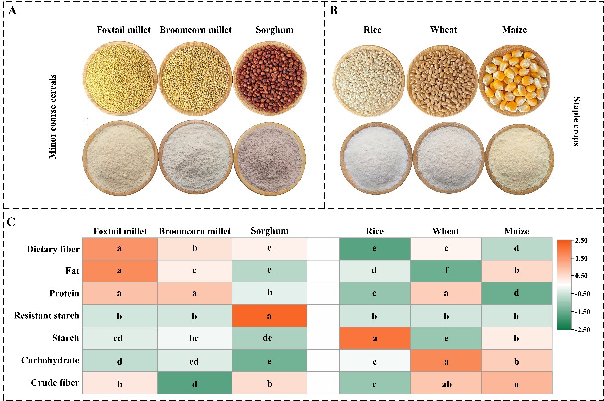 以水稻、小麦和玉米为代表的主粮作物是重要的能量来源,具有显著高的碳水化合物。而杂粮在膳食纤维含量上具有显著优势。此外,谷子(小米)具有显著高的脂肪(5.13g/100g)和蛋白(12.5g/100g)含量。高粱在抗性淀粉方面尤为突出(37.78 g /100 g ),高于其他谷类作物52-126倍。