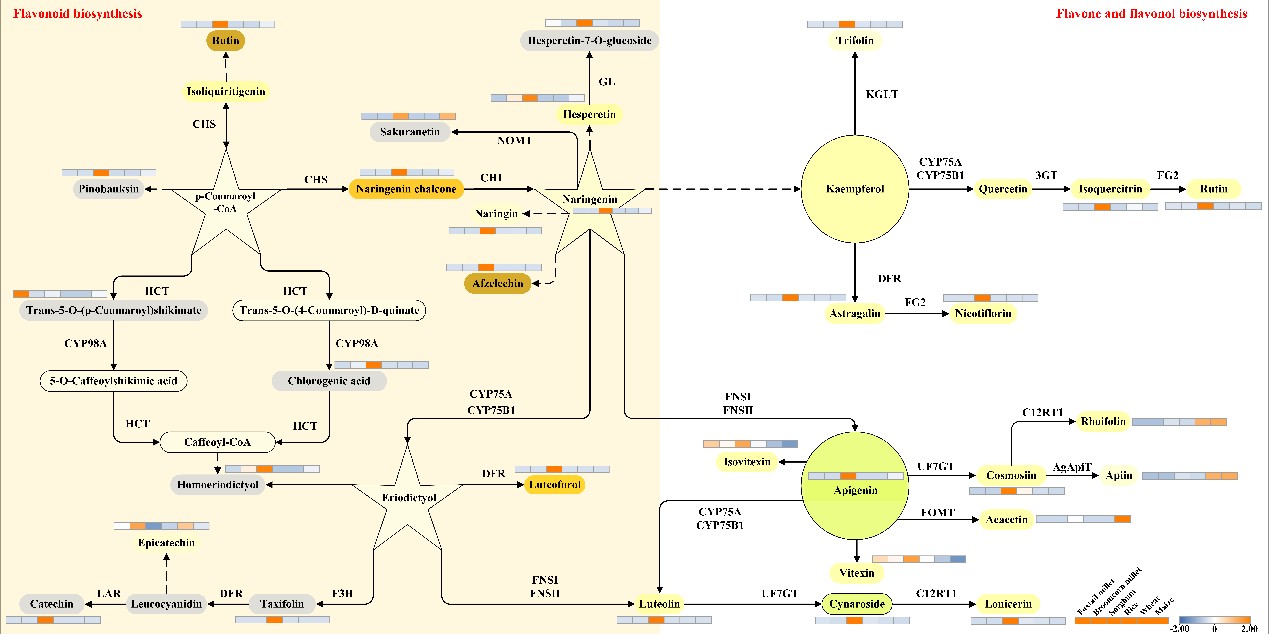 图5 杂粮与主要粮食作物的类黄酮、黄酮及黄酮醇生物合成分析