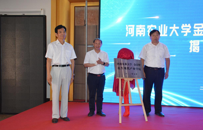 河南省农业农村厅副厅长王俊忠、校长介晓磊和河南金沃野农业发展有限公司董事长李宪挺共同为斗鱼直播