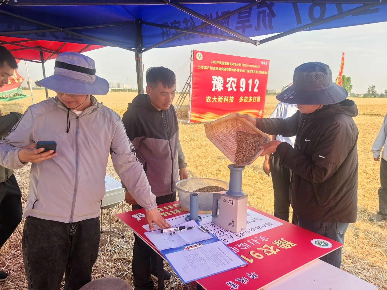 在新乡县合河乡建立的高产、耐逆、抗病突破性小麦新种质“豫农912”千亩高产示范方(1136亩)进行现场实打验收。