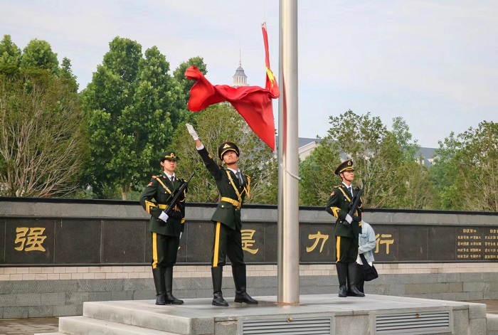 仪式开始,英姿飒爽的国旗护卫队队员们护送鲜艳的五星红旗进场,伴随着庄严的国歌,五星红旗冉冉升起。在场的师生行注目礼,深怀对祖国无限的热爱和崇高的敬意。