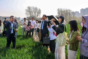 科教园区。王永华研究员带领师生们走在田陇上,近距离观察小麦穗杆,为师生做小麦春管的技术培训。“春分麦起身,肥水要紧跟”,王老师指出春分是小麦管理的关键期,小麦开始返青拨节,生长速度加快,此时田间管理非常关键,并用生动诙谐的语言从如何预防小麦倒春寒,如何产出高产高质的品种等方面为师生展开详细介绍。学生们由课堂理论走进田间实践,认真倾听王老师的讲解,更加直观深刻地认识到小麦生产全过程的技术要点和注意事项。