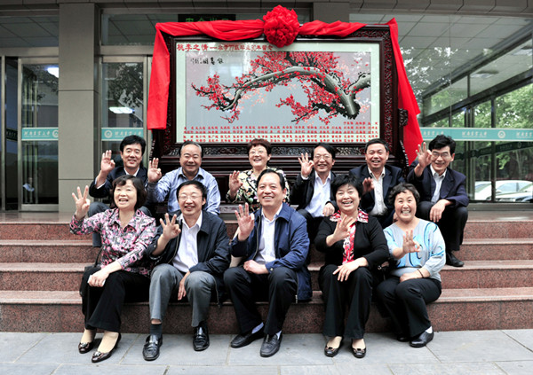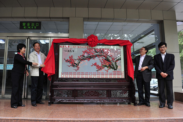 77级农学系校友也荣归母校,并为母院送来一份贺礼——王成喜名画《报春图》大型汴绣工艺屏风。