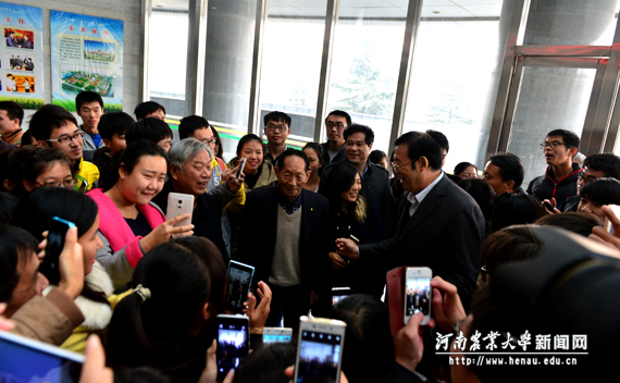 在听到袁隆平院士带领科研团队刻苦攻关,超级杂交稻亩产连续突破700公斤、800公斤、900公斤,研究水平和应用效果在世界上遥遥领先,保障了中国13亿人的粮食安全,拯救了世界数以千万计的饥饿人民的时候,现场观众数次报以热烈的掌声,向袁隆平院士表达敬意。在得知袁隆平院士将以河南农大导师的身份面向我校招收博士研究生和硕士研究生时,现场一片沸腾,为此感到骄傲和自豪。