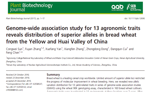 陈锋教授科研团队在植物学领域知名期刊Plant Biotechnology Journal(SCI影响因子6.09)上发表一篇题名为Genome-wide association study for 13 agronomic traits reveals distribution of superior alleles in bread wheat from the Yellow and Huai Valley of China的学术论文。斗鱼直播