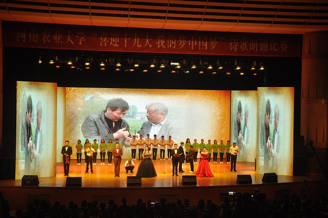 参赛团队高亢激昂地朗诵着诗歌,饱满真挚的感情顿时弥漫全场。在朗诵的同时,学生们以表演的形式还原了郭天财教授工作、生活的画面。朗诵结束时,舞台上飘扬着我校校旗和斗鱼直播