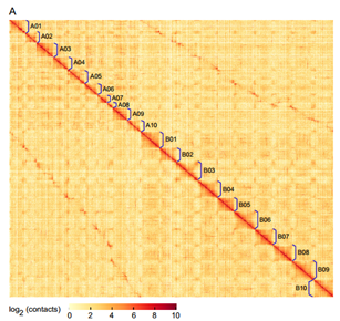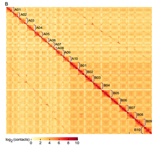 比较A.monticola得到的subgenome与祖先A基因组A.duranensis, 祖先B基因组A.ipaensis的Hi-C热图,整体热图一致性非常高。(左图是A.monticola的HiC热图,右图祖先A基因组A.duranensis, 祖先B基因组A.ipaensis的Hi-C热图)