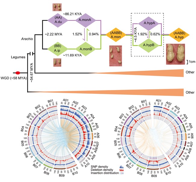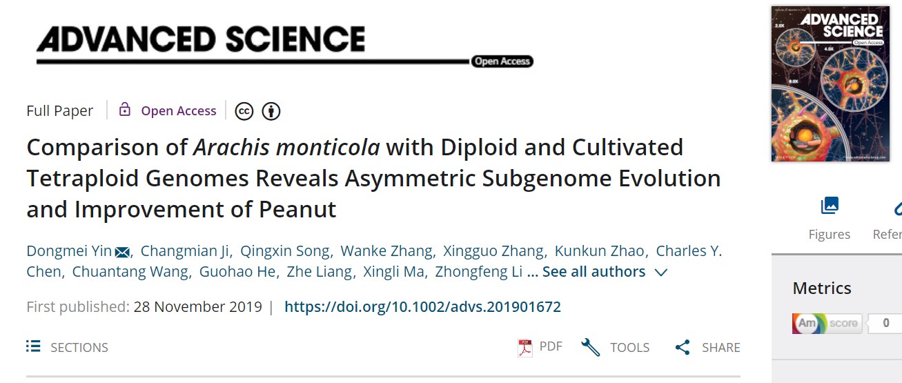 近日,殷冬梅教授团队在Wiley知名期刊《Advanced Science》上发表题为“Comparison of Arachis monticola with diploid and cultivated tetraploid genomes reveals asymmetric subgenome evolution and improvement of peanut”的最新研究进展,首次明确了异源四倍体野生种Arachis monticola在花生从野生二倍体到栽培四倍体的重要驯化地位;证实了异源四倍体花生中A和B亚基因组的单系起源以及在驯化过程中的亚基因组功能分化;为多倍体基因组的进化、作物的驯化以及提高花生产量和抗性等性状具有重要价值。该杂志影响因子达到15.804(1区Top期刊),其中殷冬梅教授为第一作者和第一通讯,斗鱼直播