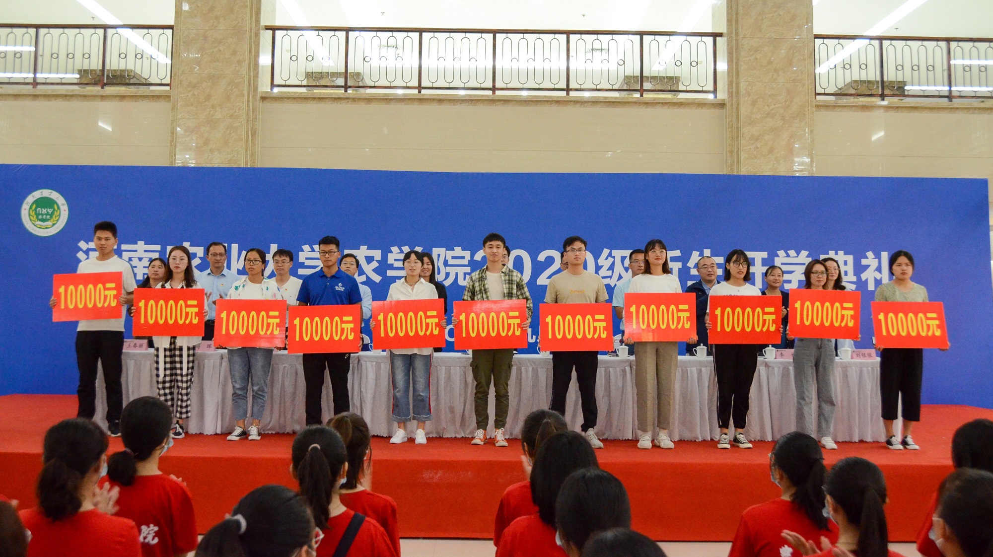 在欢乐的乐曲声中,与会领导老师分别为10名本科生新生和11名研究生新生入学奖学金获得者颁奖,每人奖金1万元。