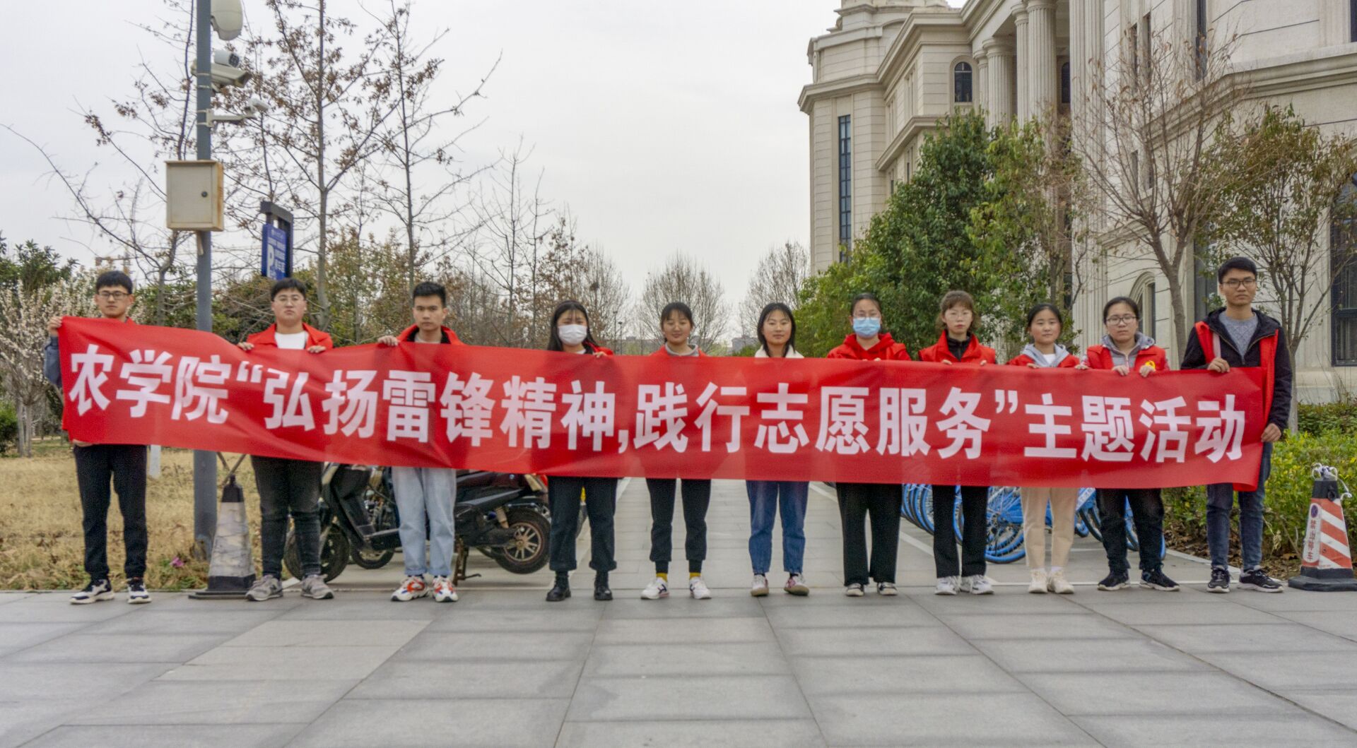 各个班级的志愿者们身穿红马甲,率先在印有“弘扬雷锋精神,践行志愿服务”的条幅上签字,志愿者们穿梭于整个龙子湖校区的校园内,认真打扫校园中的垃圾,帮助保洁员清理杂物,并将校园内的共享单车、私人自行车以及电动车摆放整齐。志愿者们纷纷以实际行动践行着雷锋精神。