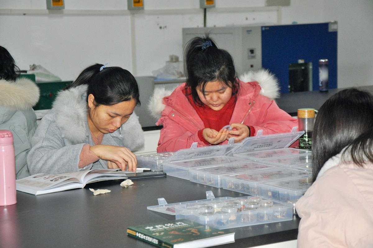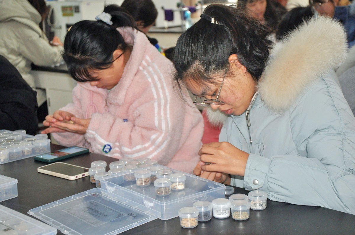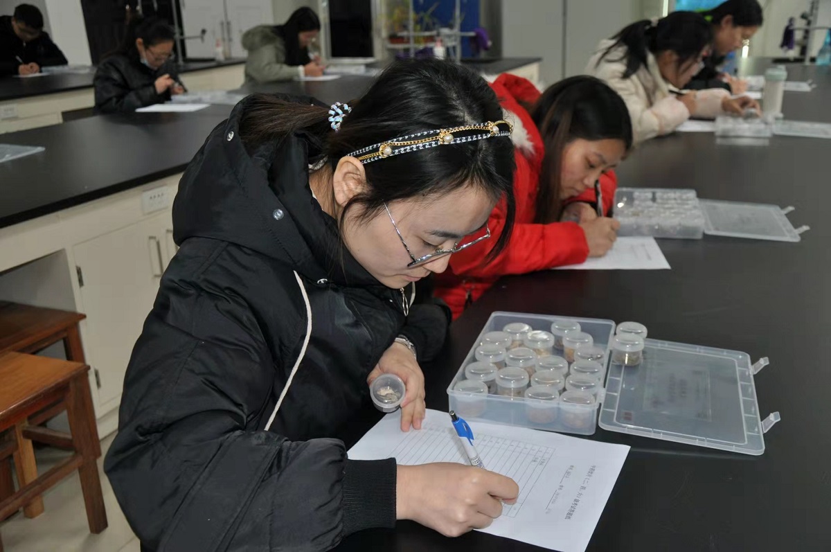 中药学专业学生学科兴趣,提高饮片快速鉴别水平,12月25日,中药鉴定学课程指导老师张红瑞在实验楼组织进行一场特殊的“四六级”考试——中药饮片等级考试,中药学专业2019级部分学生学习并参加考试。
