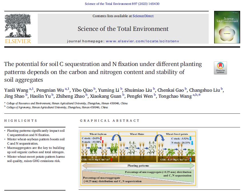 王同朝教授领衔的 “作物节水栽培耕作理论与技术团队” 在不同种植模式对土壤团聚体分布和碳氮固存的研究方面取得重要进展,研究结果以“ The potential for soil C sequestration and N fixation under different planting patterns depends on the carbon and nitrogen content and stability of soil aggregates” 为题在国际著名学术期刊 《Science of the Total Environment》(IF=9.8) 上发表。