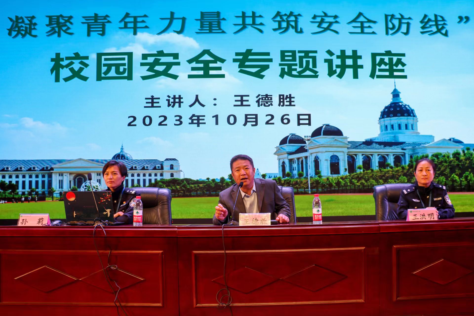 联合林学院于文化路校区大礼堂举行主题为“凝聚青年力量共筑安全防线”的校园安全专题讲座,此次讲座邀请到我校文化路校区保卫处处长王德胜,文化路派出所民警孙莉、王洪明进行宣讲,2023级农、林两学院学生及辅导员参加此次讲座。王德胜担任此次会议的主讲人。