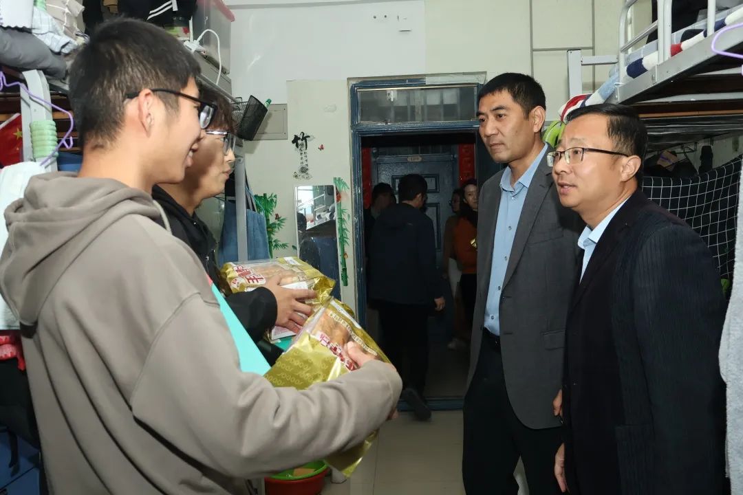 考研学子特别定制,其中,过冬必备的暖水瓶陪伴考研学子度过考研难关,让学生们在寒冷的冬天感受到学院带给他们的温暖,预祝考研学子顺利上岸!同时,学院还准备有寓意考研解题时“面面俱到”的面包,祝福所有考研学子考试顺利,除此之外,学院还贴心地为建档立卡的学生们准备了冲锋衣。因为背靠学院,这个冬天便不再寒冷。随后,学院领导老师走进宿舍与学生深切交流,并将考研大礼包亲手送到学生手上。“在学习生活中有什么困难吗?”“有心仪的目标院校吗?”“最近备考紧张吗?”马菲耐心询问并悉心解答学生们在生活及备考过程中遇到的困惑,嘱托学生们在备考的同时也要注意保暖,时刻保持良好的身体状态,同时,鼓励大家充满信心、奋战到底,以轻松愉悦的心情迎接考试。接着,辅导员和班主任分批将暖心物资分发给学生们,鼓励大家全力以赴,不负自己。活动现场温馨感人,学生们深深地感受到学院的温暖,脸上洋溢着开心的笑容,考研学子对自己的考研之路愈发充满信心。