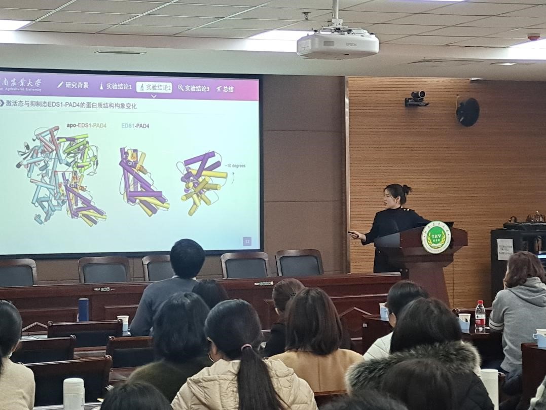 ,被聘为校杰出人才和校特聘教授,她以“Identification and receptor mechanism of TIR-catalyzed second messenger in plant immunity”为题介绍了TNLs抗病小体作为NAD+水解酶产生免疫第二信使并调控不同下游信号通路的分子机制,同时分享了自己在科研工作中的心得体会,鼓励大家勇于挑战科学难题。