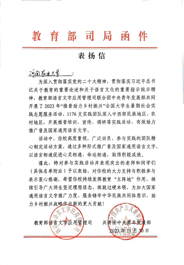 2023年“推普助力乡村振兴”全国大学生暑期社会实践志愿服务活动优秀团队发来表扬信。