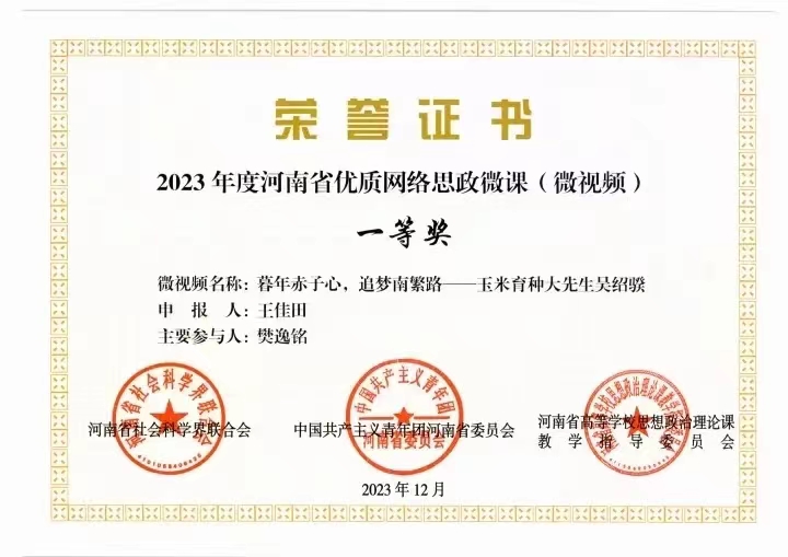 《立弘农爱国志 传厚生丰民情》和《暮年赤子心,追梦南繁路——玉米育种大先生吴绍骙》2个作品荣获大学生主题微视频赛道一等奖。