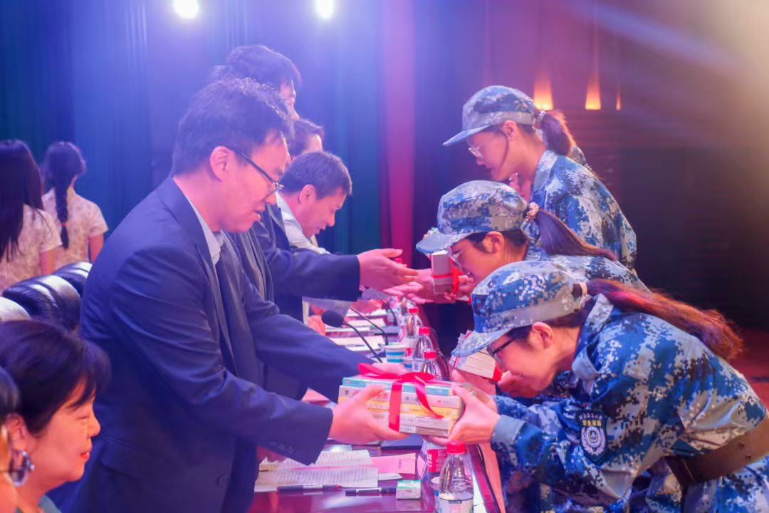 校徽。学院领导班子成员为新生赠书,向他们传递着知识的力量和对新生的殷切期望。