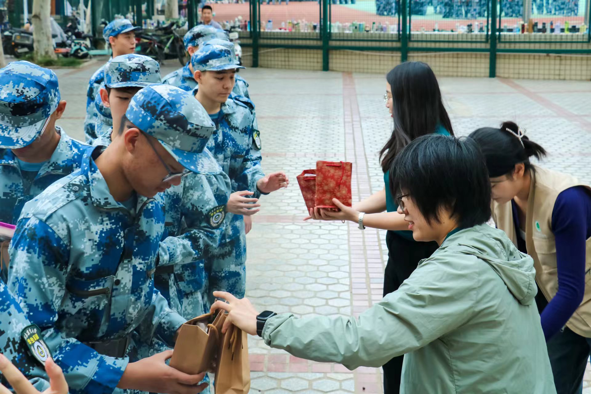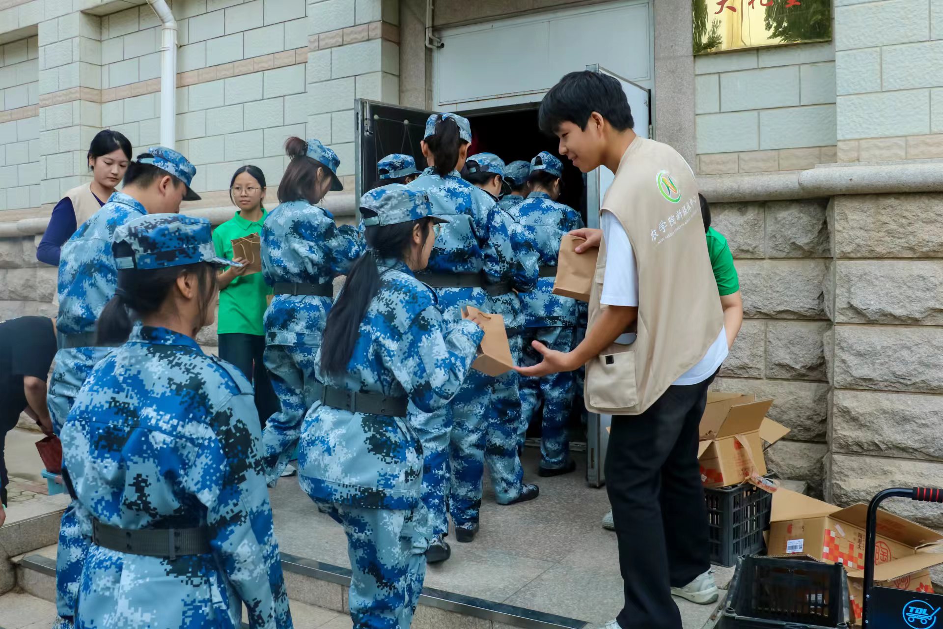 开学典礼,学院为24级新生准备了美味的月饼水果礼袋,在同学们列队步入大礼堂参加开学典礼的时候,班主任老师和助班助教将中秋礼袋发放到每位新生的手中。
