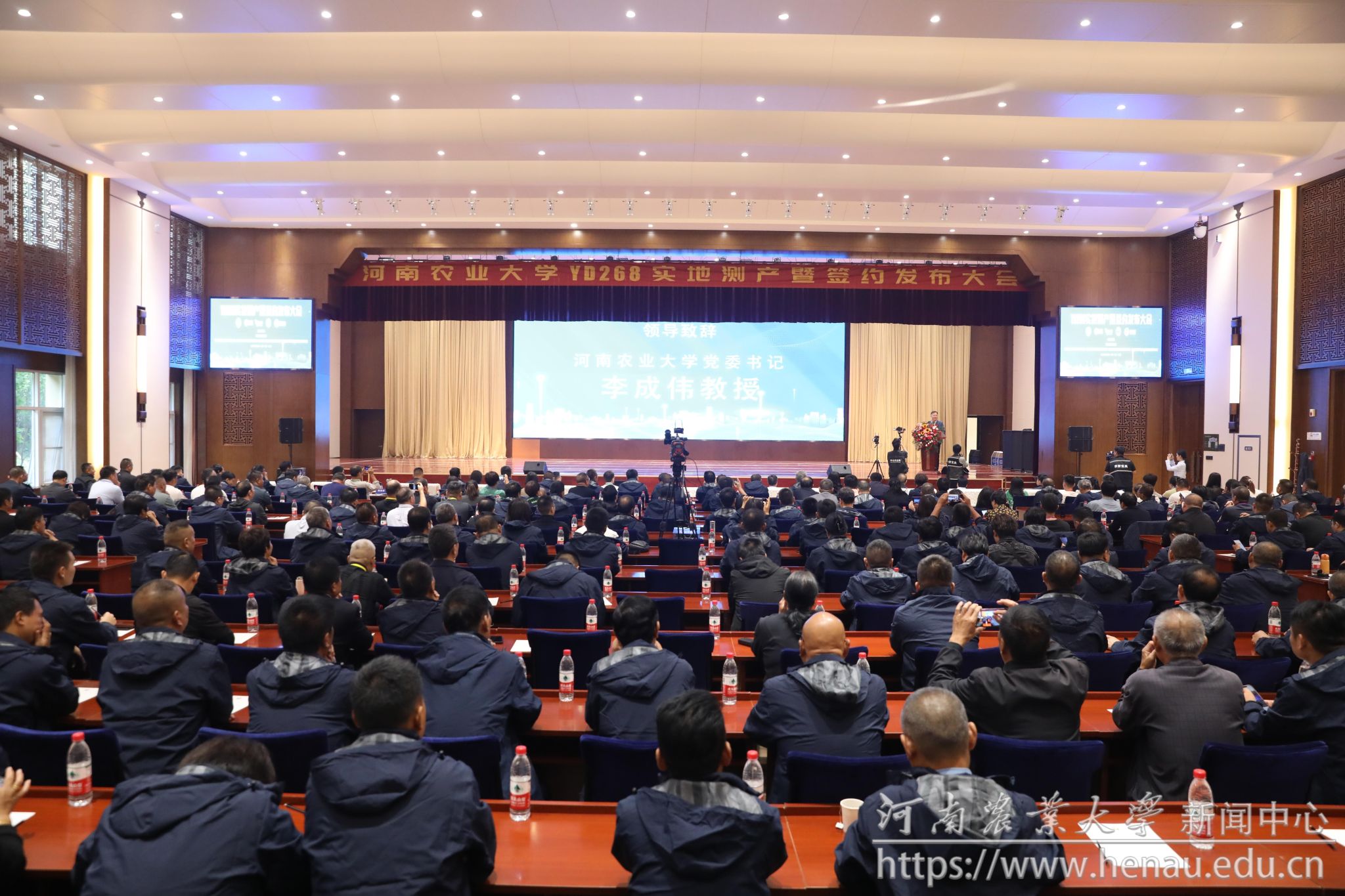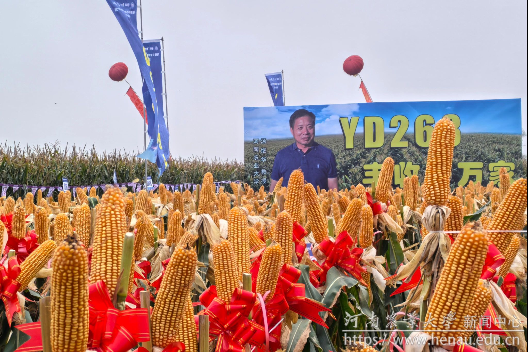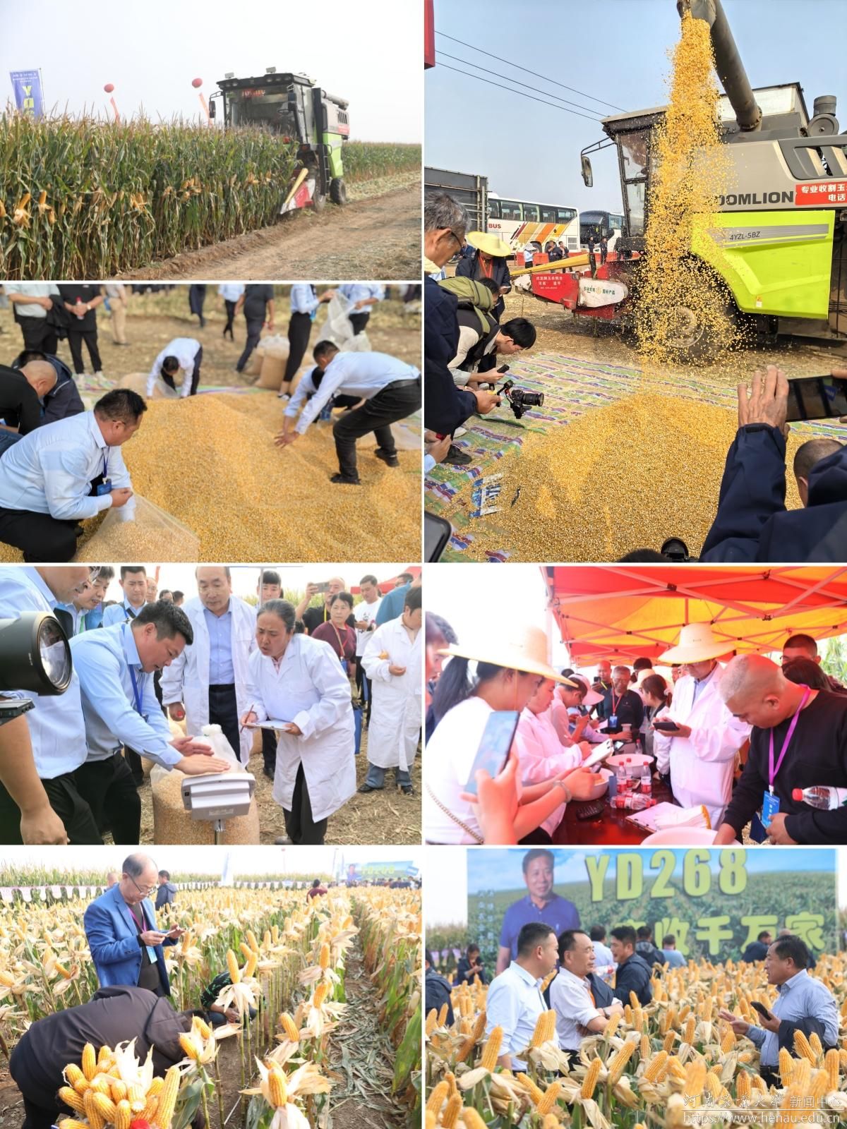 本网讯(记者 周红飞 黄璞 图片 秦晓璐 裴辉)金秋时节,正值喜迎丰收和播种希望之时。10月9日,斗鱼直播 选育的玉米新品种YD268实地测产观摩会在素有“豫北粮仓”之称的河南省鹤壁市举行。斗鱼直播 校党委书记李成伟,原校长介晓磊,学术副校长、斗鱼直播 院长王道文,学术副校长、YD268育种团队负责人汤继华出席活动。学校党委办公室、党委宣传部、社会服务处、斗鱼直播 负责人,YD268育种团队成员,河北兆育种业集团有限公司、北京丰度高科种业有限公司、河南黄泛区地神种业有限公司、河南慧博科瑞迪农业科技有限公司主要负责人,以及来自黄淮海玉米主产区8个省区的种子经销商和种粮大户400余名汇聚在此,共同见证YD268的机收籽粒现场测产。
