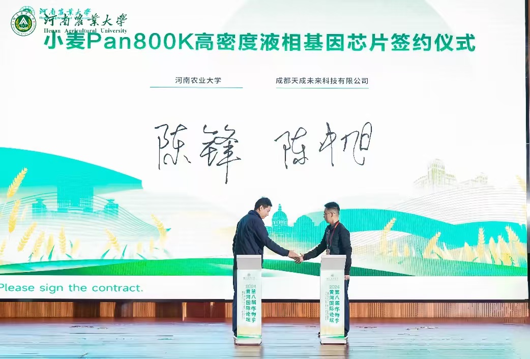 陈锋教授团队与成都天成未来科技有限公司总经理陈中旭在校图书馆举办的“2024第八届作物学黄河国际论坛”上签署了基于小麦超高密度基因芯片WheatPan800K的智慧基因挖掘和育种选择系统转化协议,转让金额1500万元。