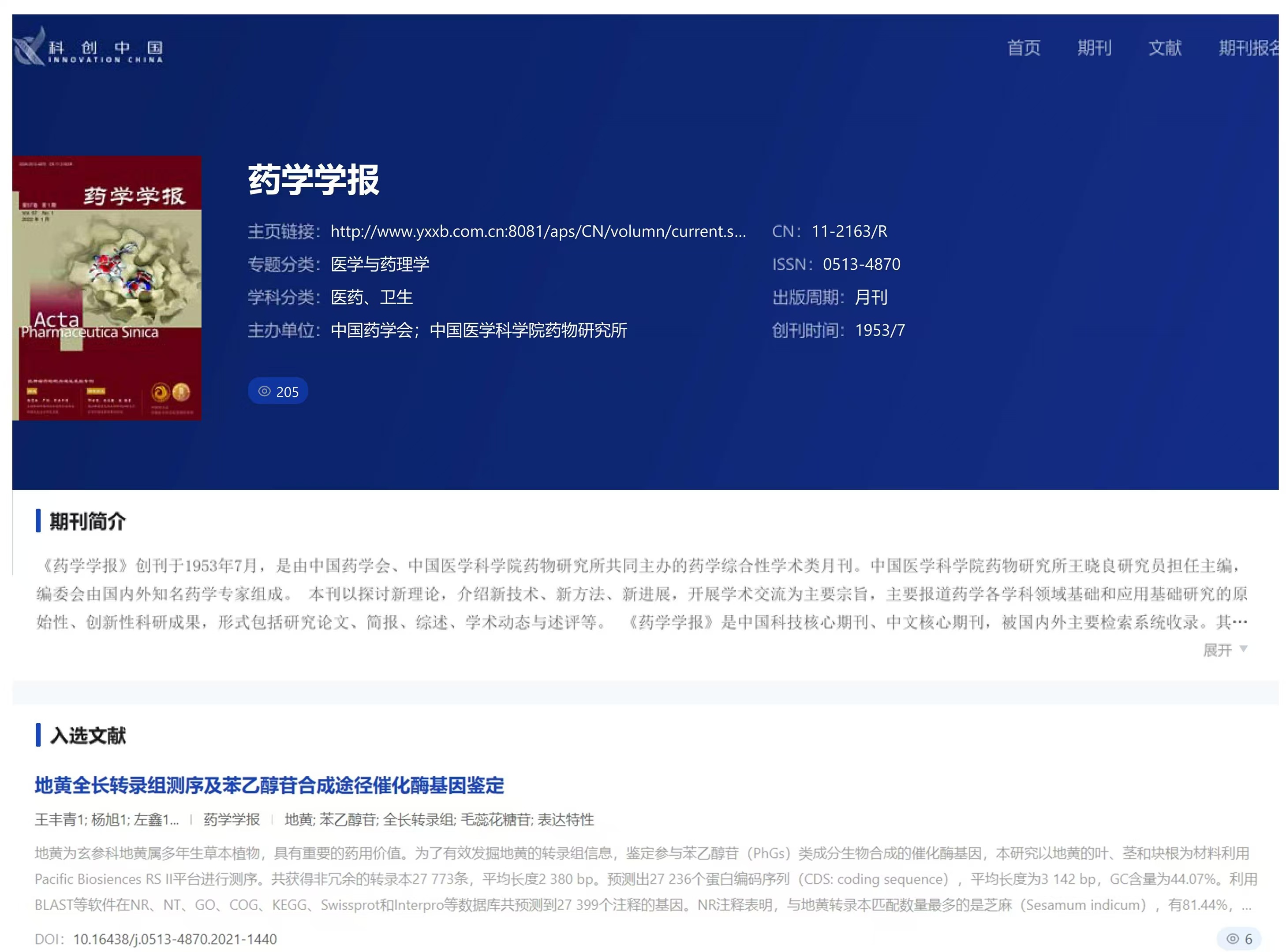 《药学学报》创刊于1953年7月,是由中国药学会、中国医学科学院药物研究所共同主办的药学综合性学术类月刊。主要报道药学各学科领域基础和应用基础研究的原始性、创新性科研成果,形式包括研究论文、简报、综述、学术动态与述评等。《药学学报》是中国科技核心期刊、中文核心期刊,被国内外主要检索系统收录。其中,已收录本刊的国际著名检索系统有美国医学索引、美国化学文摘、SciFinder Scholar、荷兰Scopus数据库、国际药学文摘、俄罗斯文摘杂志、波兰《哥白尼索引》和美国《乌利希国际期刊指南》等。