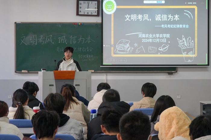 于龙子湖校区繁塔楼c103召开“文明考风,诚信为本”考风考纪纪律教育会。院团委老师杨航,2022级及2023级全体班长团支与会,学实部工作人员张鑫鹏主持会议。