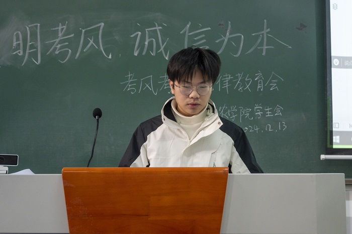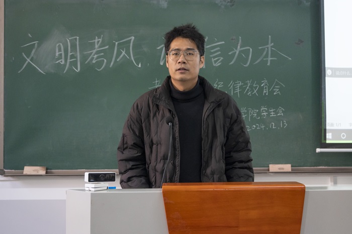 院团委老师杨航发表重要讲话,进一步强调诚信对于学校教学秩序及学生个人成长的重要性,深入浅出地向学生传达诚信的重要性,并引导他们将其内化于心、外化于行;鼓励学生们求真务实,以实际行动践行承诺;组织学生们以班级为单位,签署学生考试诚信承诺书;提醒学生们好好复习积极备考,而且要调整好作息,在考试中保持良好的心态,以诚信的态度面对每一场考试,自觉维护考场秩序。