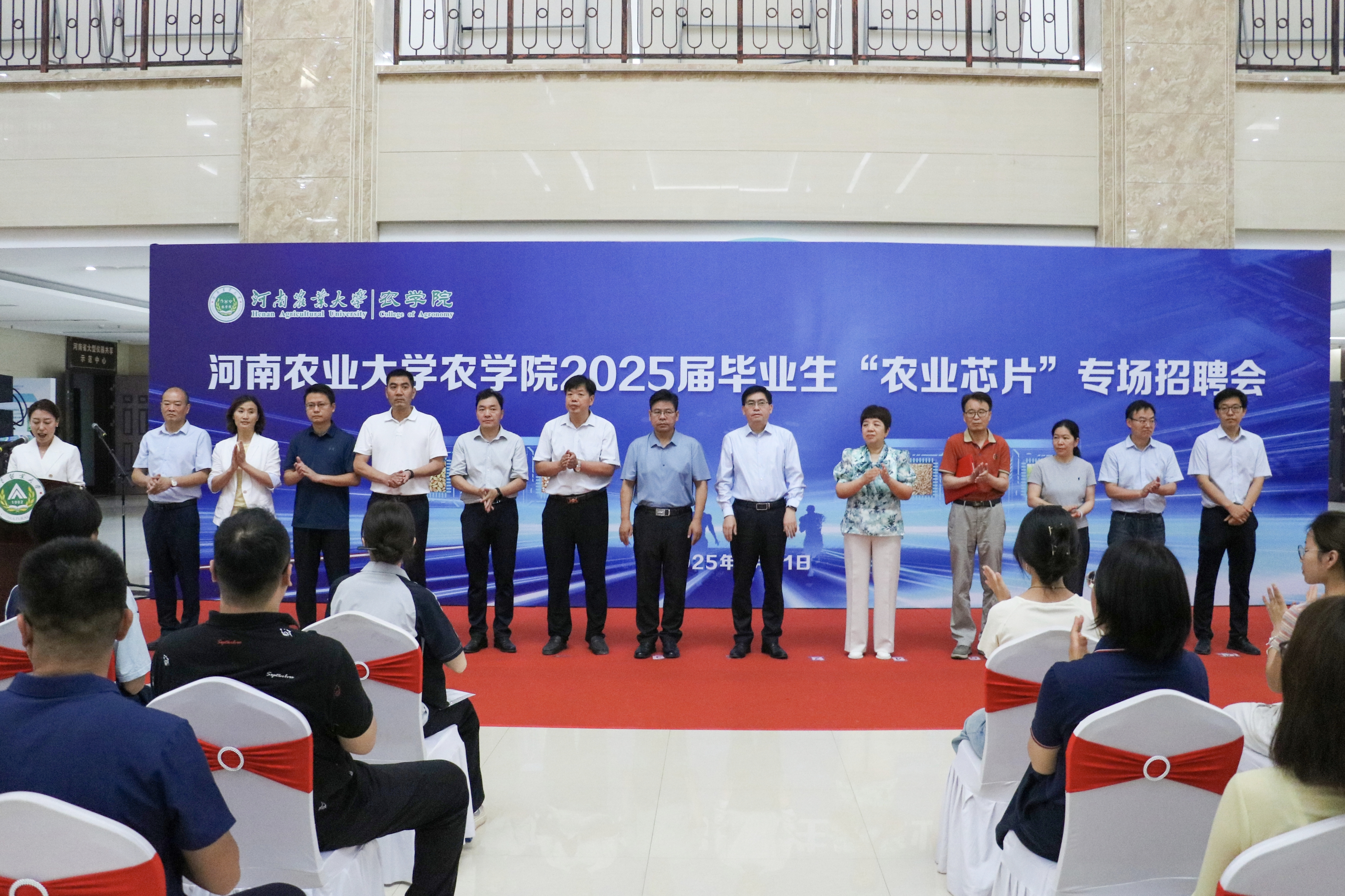 副校长郭战伟宣布招聘会开幕,他指出种子作为农业"芯片",是保障国家粮食安全的核心命脉。此次招聘会既是落实学校毕业生就业提质扩面计划的务实之举,也是服务河南省"中原农谷"建设、助力乡村振兴的具体实践。他期望学院以“农业芯片”专场招聘会召开为契机,实现人才供需精准对接,培育更多"一懂两爱"三农人才,为国家粮食安全及地方发展贡献力量。