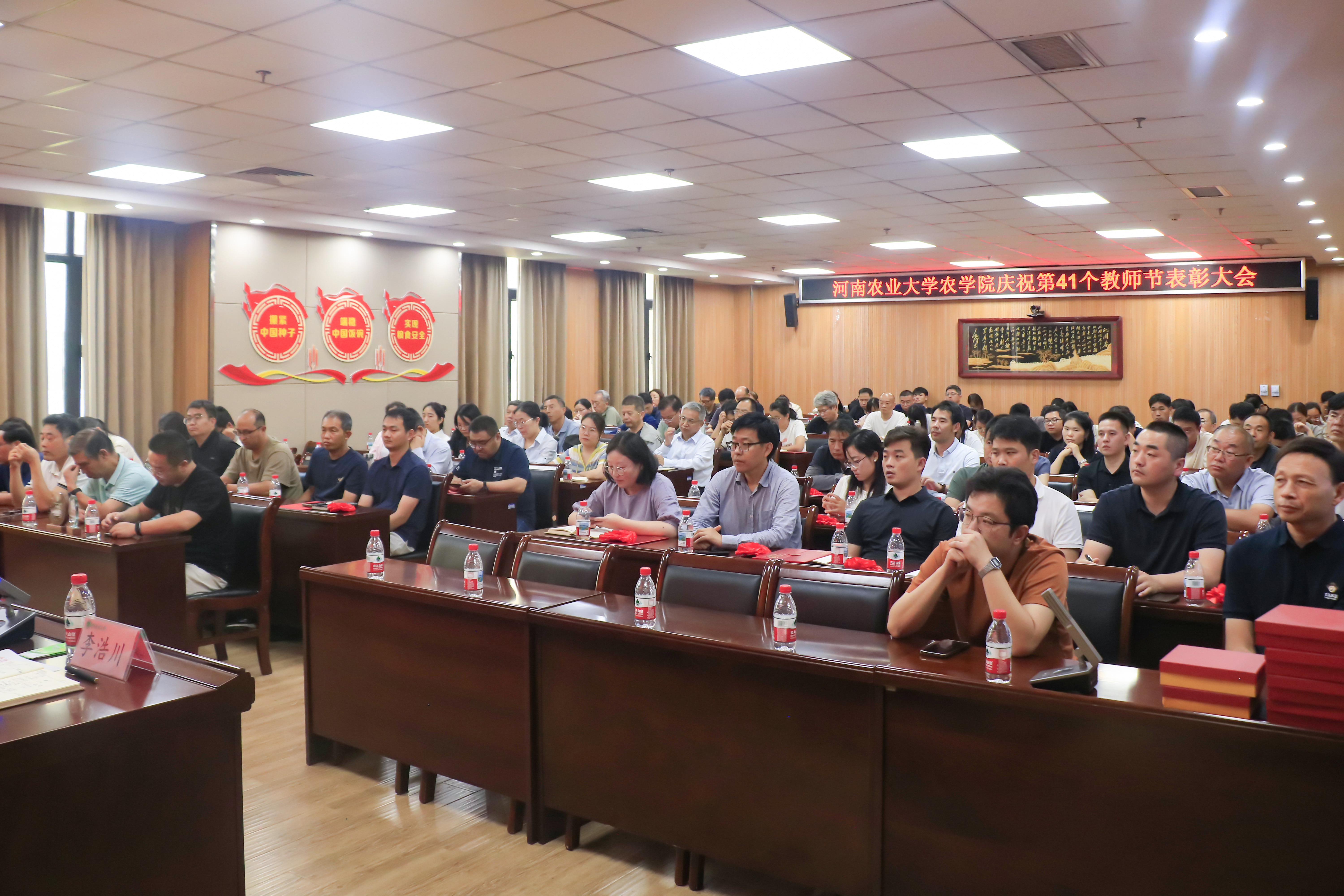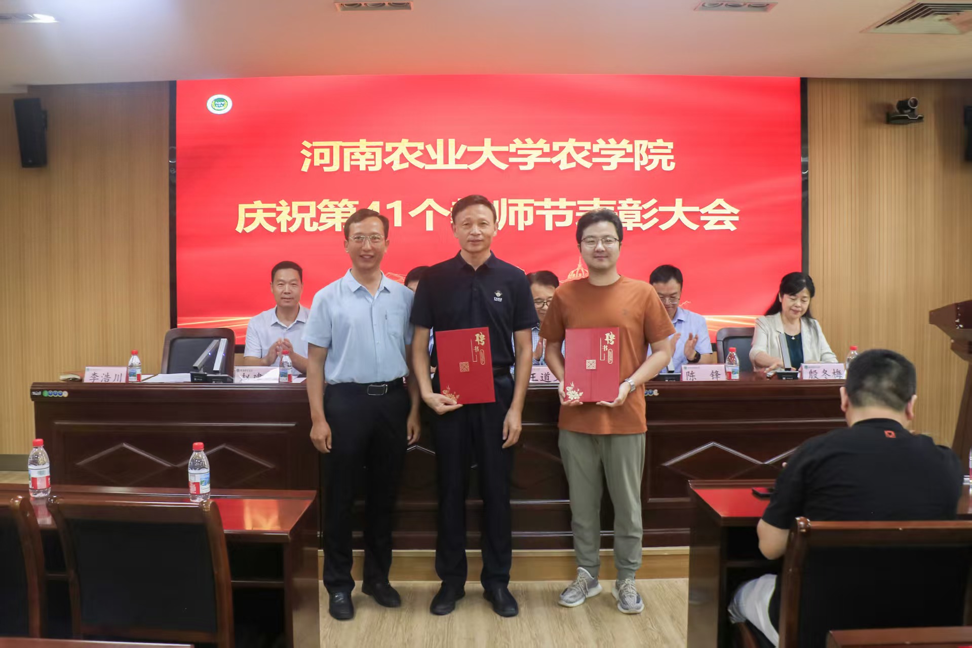 于龙子湖校区第一实验楼南321、南322会议室举办第41个教师节表彰大会。院领导班子成员及全体教职工参加此次会议,会议由副院长赵建一主持。