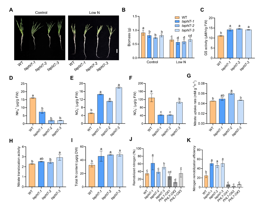 TaPHL7功能缺失在开花期旗叶中表现为总氮含量增加,灌浆期籽粒中 GS 酶活性增加,氮同化及再动员能力增强;而过表达