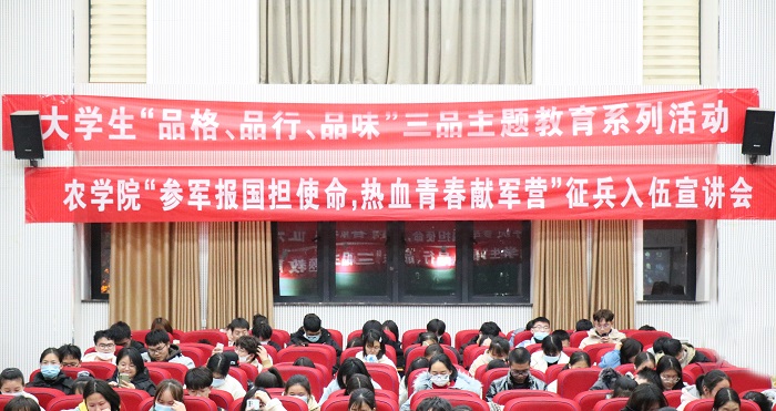 于龙子湖校区大教室七开展了主题为“参军报国担使命,热血青春献军营”征兵入伍宣讲会,旨在引导大学生锤炼品格、塑造品行、涵养品位。院团委老师唐朝、五位退伍老兵及2021级学生代表参加会议。本次会议由团委干事刘雷影主持。