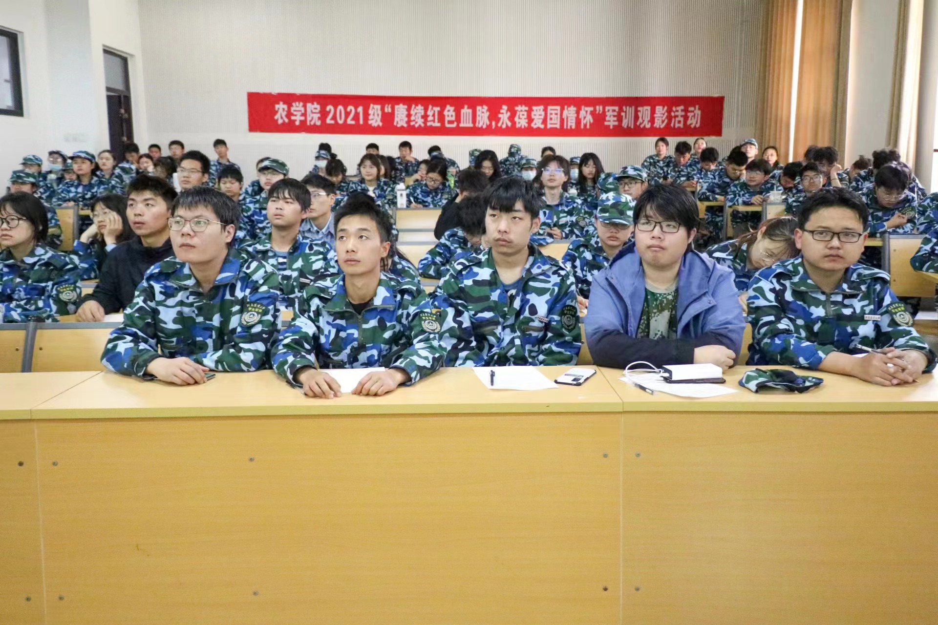 于龙子湖校区C202、D110、D102教室举办《1950他们正青春》军训观影活动,院团委副书记唐朝,全体承训教官及斗鱼直播